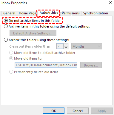 Step 2. In the opening Properties dialog box, please enable the AutoArchive tab, and check the Do not archive items in this folder option. See screenshot.