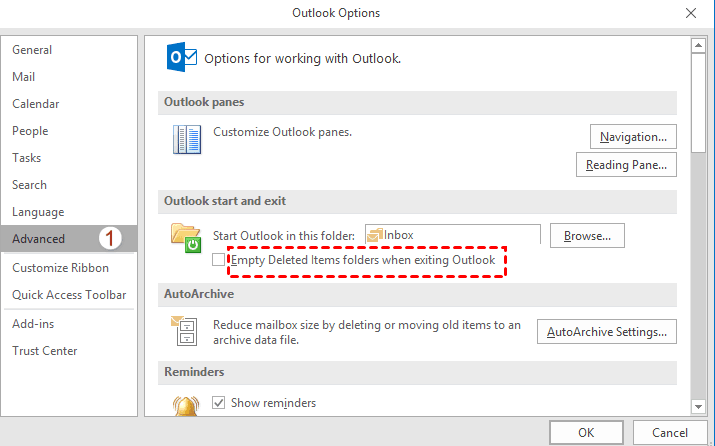 Step 2. In the Outlook Options dialog box, please click Advanced in the left bar, and then uncheck the Empty Deleted Items folders when exiting Outlook option in the Outlook start and exit section. See screenshot.