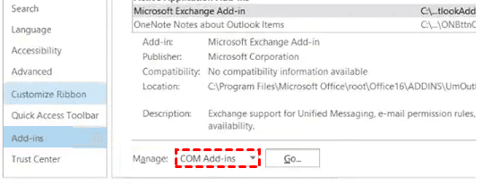3. Click Add-ins in the left pane. In the Manage section, select COM Add-ins and click Go to open the add-ins on your Outlook.