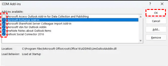 4. Uncheck all the extensions and hit on the OK button to deactivate them. Then, restart Outlook to see if the Outlook is not connected to server error is resolved.