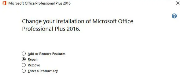 Step 5. Inside the Modify window, you will see options such as Add or Remove Features, Repair, Remove, and Enter a Product Key. Click on the radio button in front of Repair.