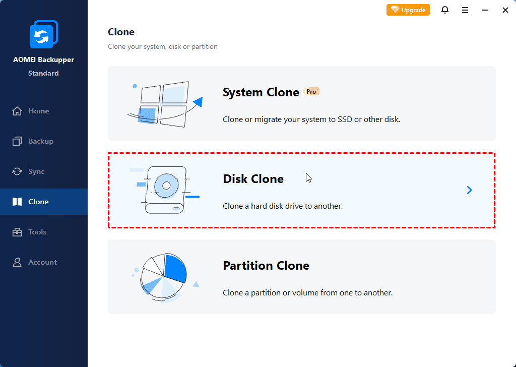 2. Install and start AOMEI Backupper Standard. Click Clone and then Disk Clone.