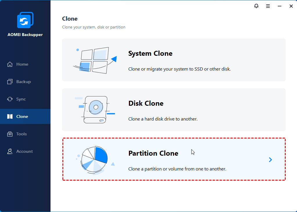 Step 1. Launch this software, choose Partition Clone under the Clone tab.