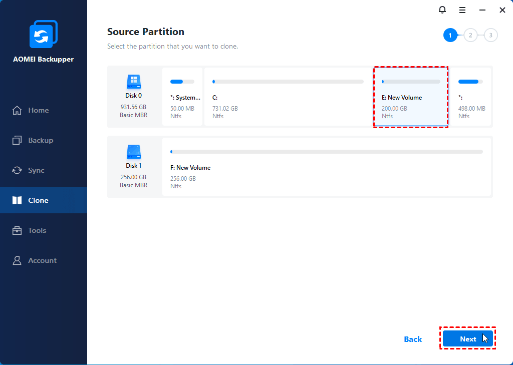 Step 2. Choose a source partition, E partition for example. Click Next to continue.