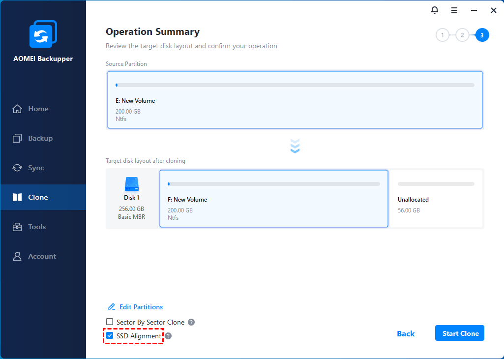 Step 4. Tick the SSD Alignment option and then click Start Clone, it will align partition during the cloning process.