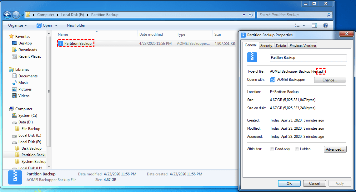 4. After backup is completed, it generates an xxx.adi backup image file in the destination. After completing the partition/volume backup, you can easily restore your partition/volume in the event of a partition/volume crash. For more details about restore steps, please access Partition/Volume Restore.