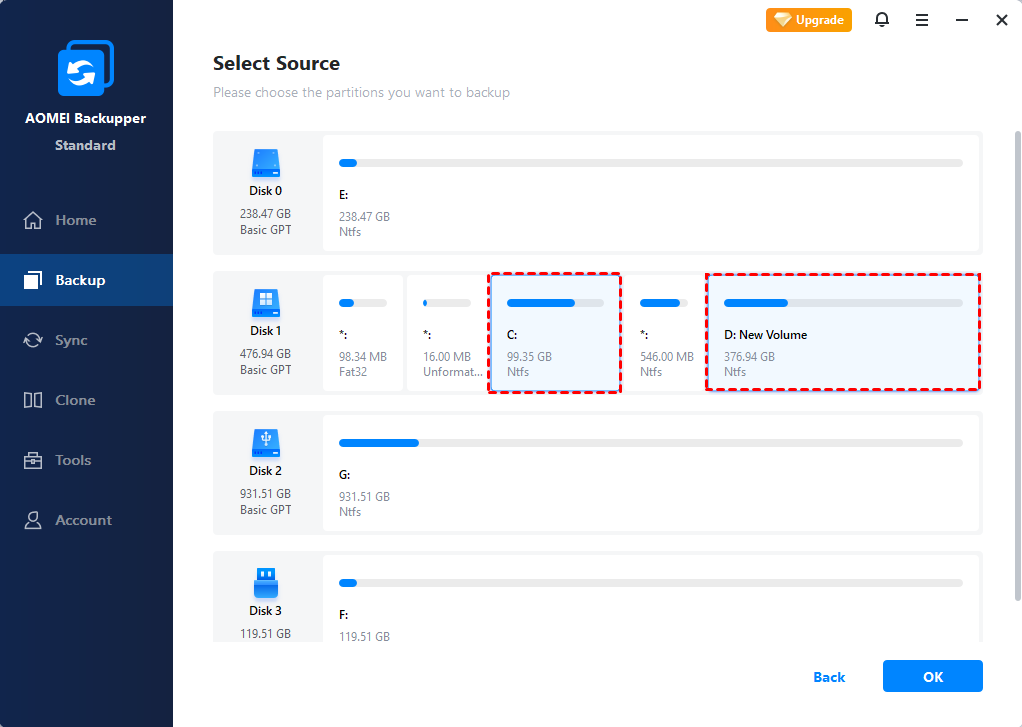 Click "Select Source" and select partitions or volumes that need to be backed up.