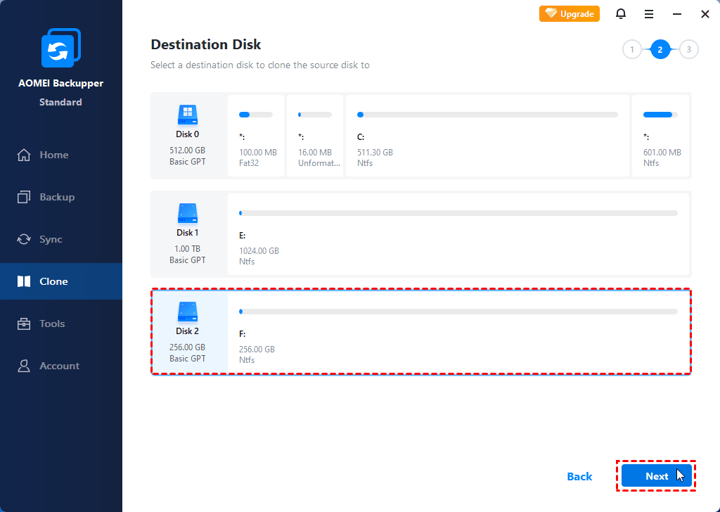 ☛Note: the standard edition only supports cloning non-system disks. if you want to clone a disk containing OS, please upgrade to higher editions such as AOMEI Backupper Professional.