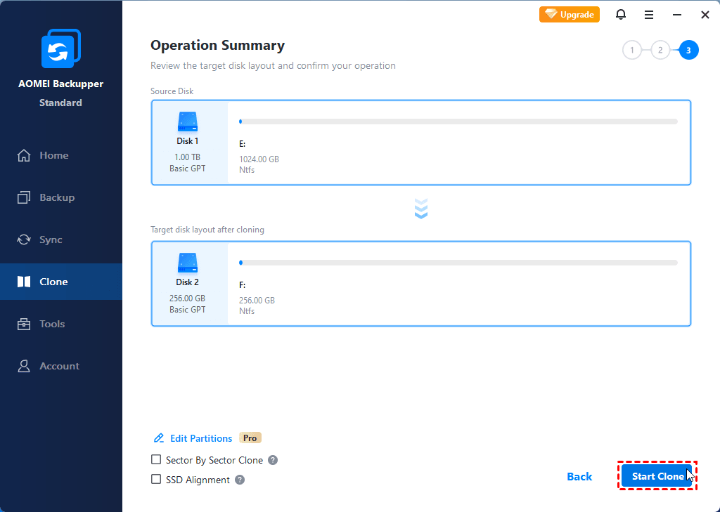✱By default, this disk clone software only copies the existing data (the used sectors) on the disk. However, if you want to clone all sectors on the source disk, whether they are used or not, you can use the "Sector by sector clone" option.