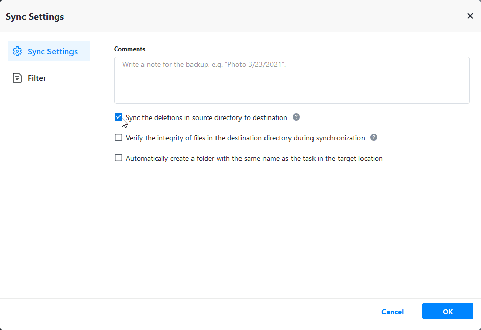 Verify the integrity of files in the destination directory during synchronization: If a file in the source directory does not exist in the destination directory, the missing files will be synced to the destination directory to ensure the integrity of files. (e.g., files in the destination directory are deleted manually.) Ticking this option will also increase the sync time.