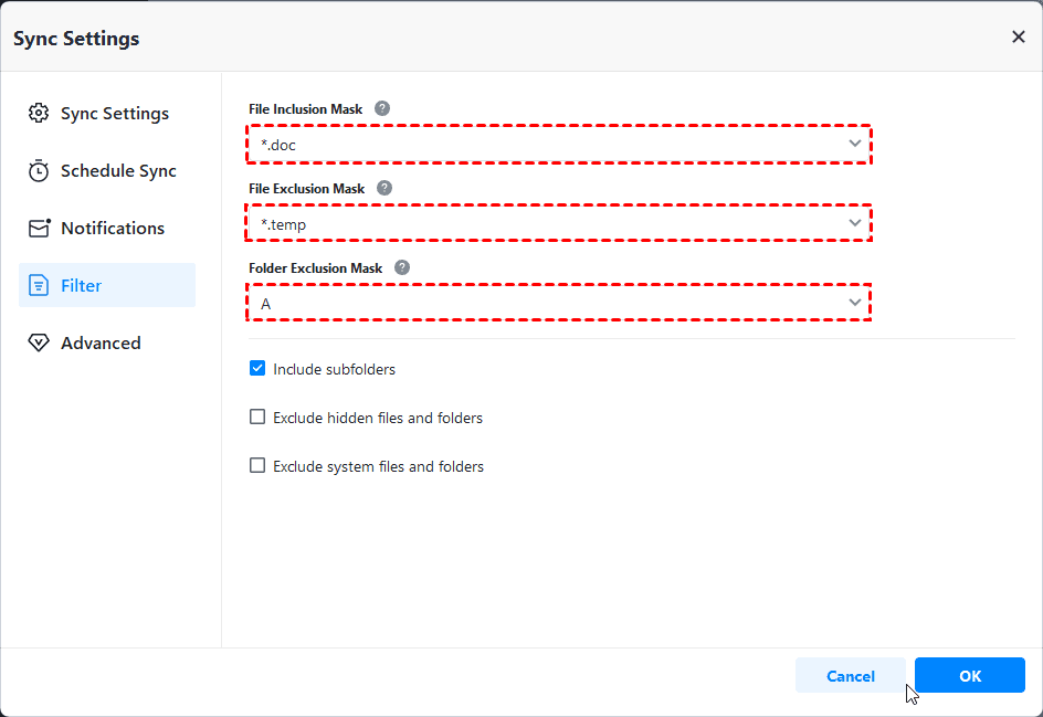With this mask, you can configure to exclude according to file extensions, such as .temp, .tmp, .bak, and so on. As a result, all files with the same extensions will not be synced to the destination location.