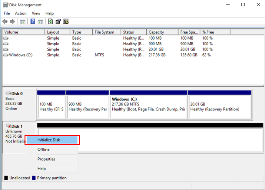 Press Windows + R to open the Run window, type diskmgmt.msc and click OK to open it. Right-click the not initialized disk and select Initialize Disk, then partition style (GPT or MBR), click OK to initialize disk.