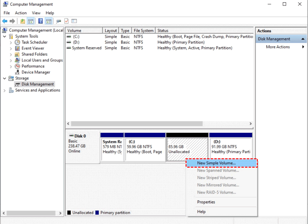 Open Disk Management, right-click the unallocated space on the disk, and select New Simple Volume... to access the New Simple Volume Wizard. Click Next and then select disk size, drive letter and file system (NTFS or FAT32), click Next and Finish.