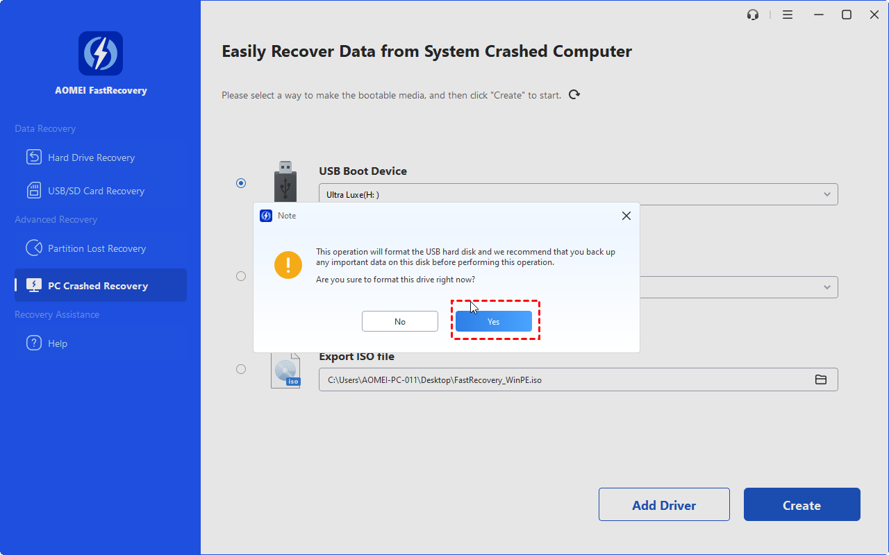 3. A confirmation window will pop up indicating that the USB drive is about to be formatted. Click Yes to continue the formatting process. Wait until you see "Creating a bootable device was successful!"