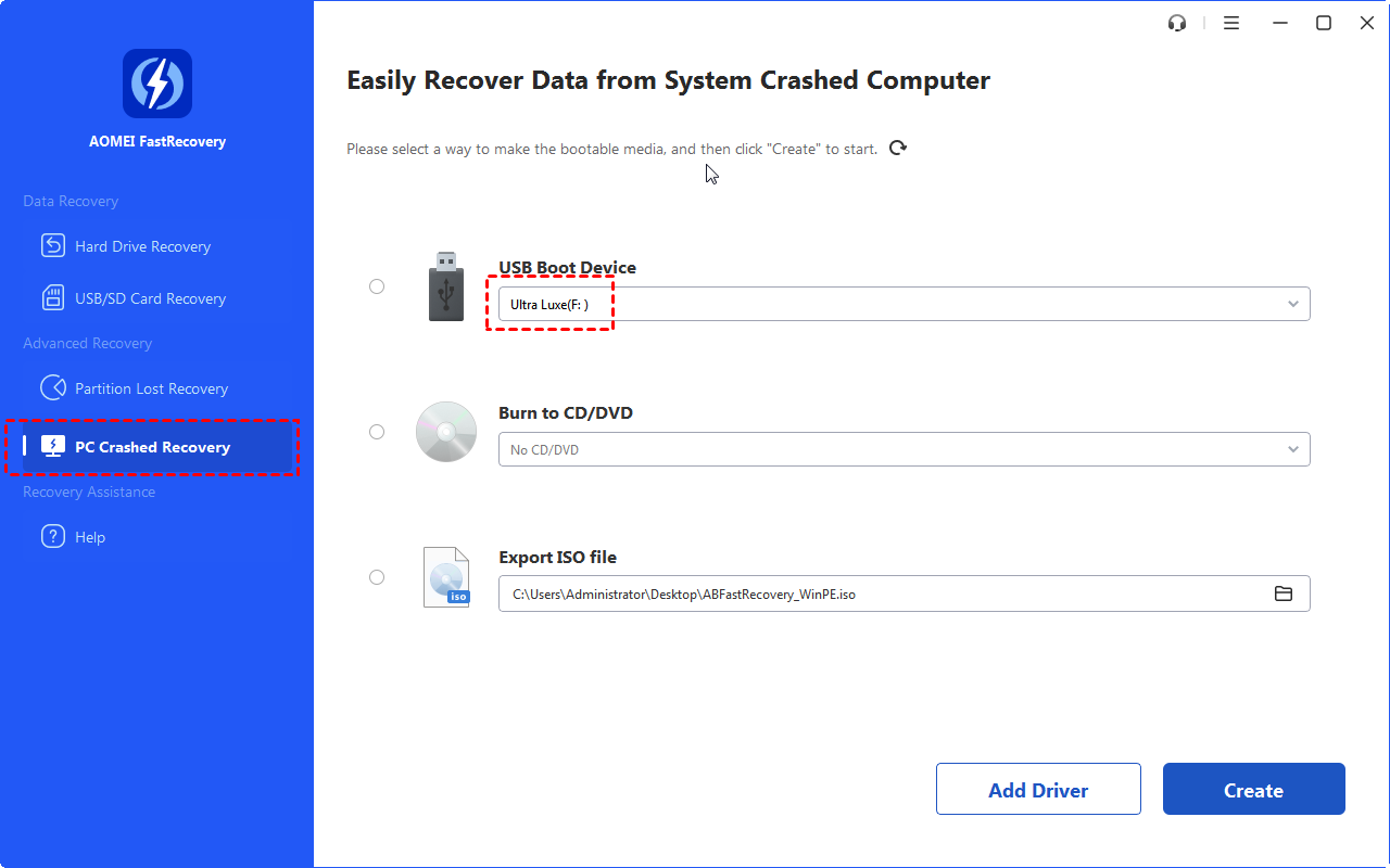 1. Open AOMEI FastRecovery on a working Windows PC. Select the "PC Crashed recovery" option on the left side.