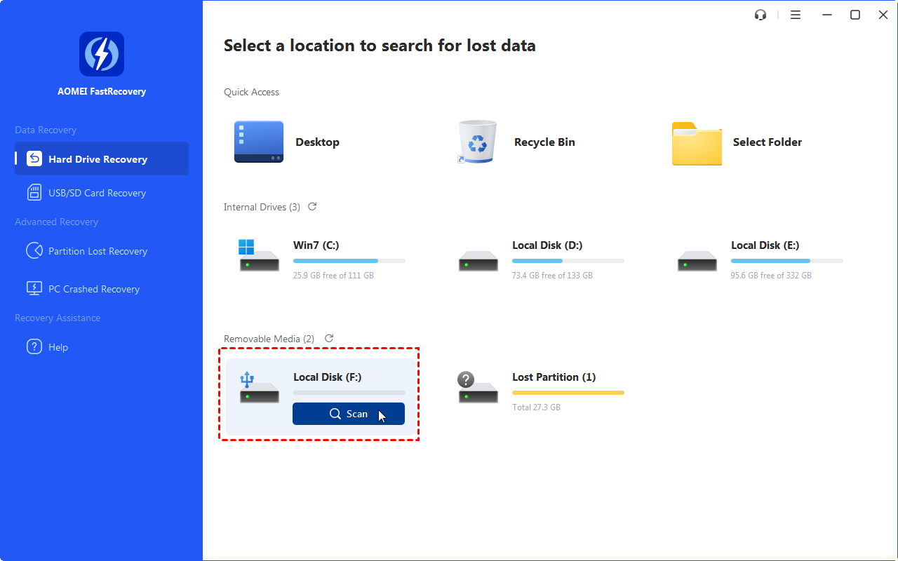 Now, download AOMEI FastRecovery on a Windows PC and connect a prepared USB drive for data recovery as well.