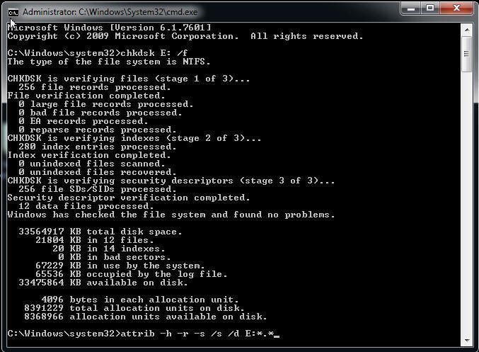 Step 2. Check if your drive has bad sectors. In the command prompt, type chkdsk E: /f and hit Enter. In this command, E refers to the drive letter of your USB device.