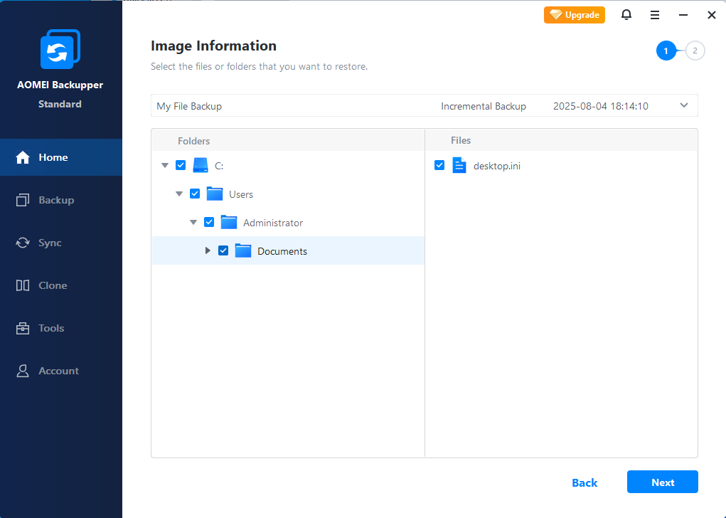 Step 2. Select a file backup image in the list and click Next. Alternatively, you can directly find the file backup task on Home page.