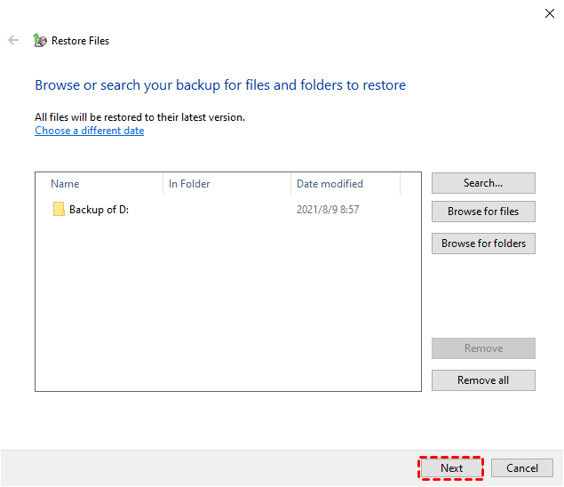 - In the Restore Files page, click Search, Browse for files or Browse for folders to find files or folders you want to restore and select them, then click Next.