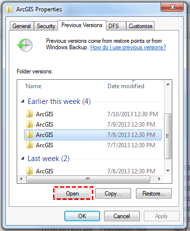 - Under Previous Version, there should be a list of files or folders that were backed up at different times and dates. Select a version of the folder before the file was deleted and click Open. This will open the folder where you can view all previous files.