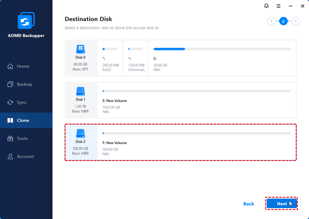 Step 3. Then choose the smaller hard drive as the destination disk and click Next.