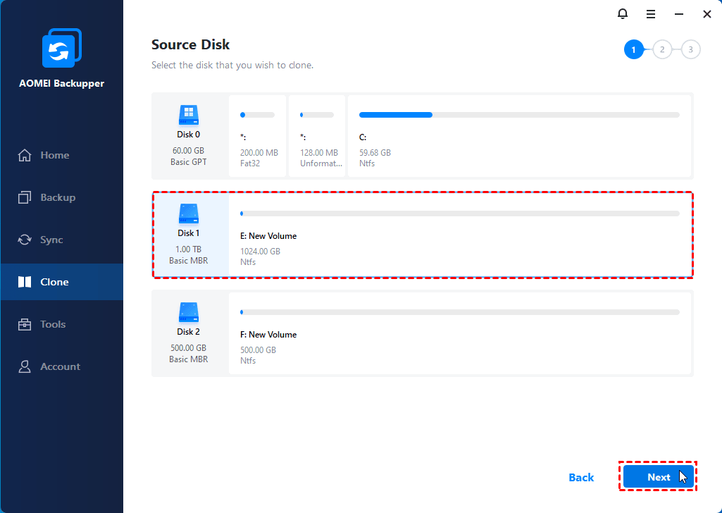 Step 2. Then choose the larger hard drive as the source disk and then choose Next.