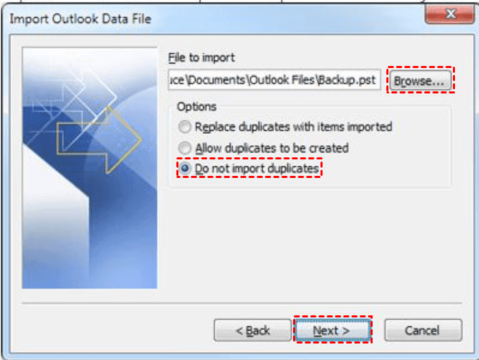 - Click on the Browse button and select the PST file you want to import contacts from. Check the box Do not import duplicates so that the data that matches existing file is not imported. Then click Next.