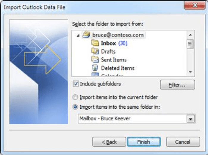 - Select the Contacts folder to import from and check the box Include subfolders as necessary. Check the box Import items into the same folder in and select your email account.