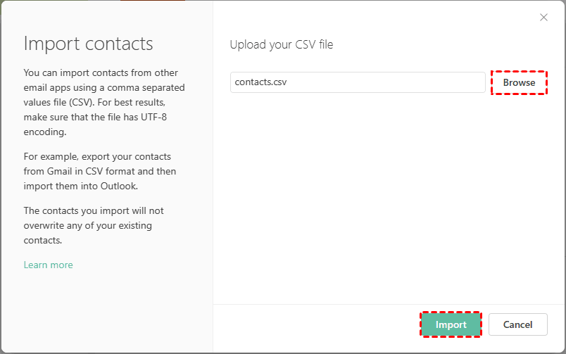 - Click Browse and select the contacts.csv file to import from. Then click Import.