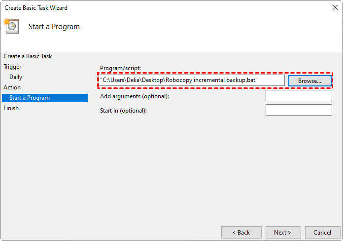 Then click Browse to select the Robocopy backup script (the .bat file) you just created.
