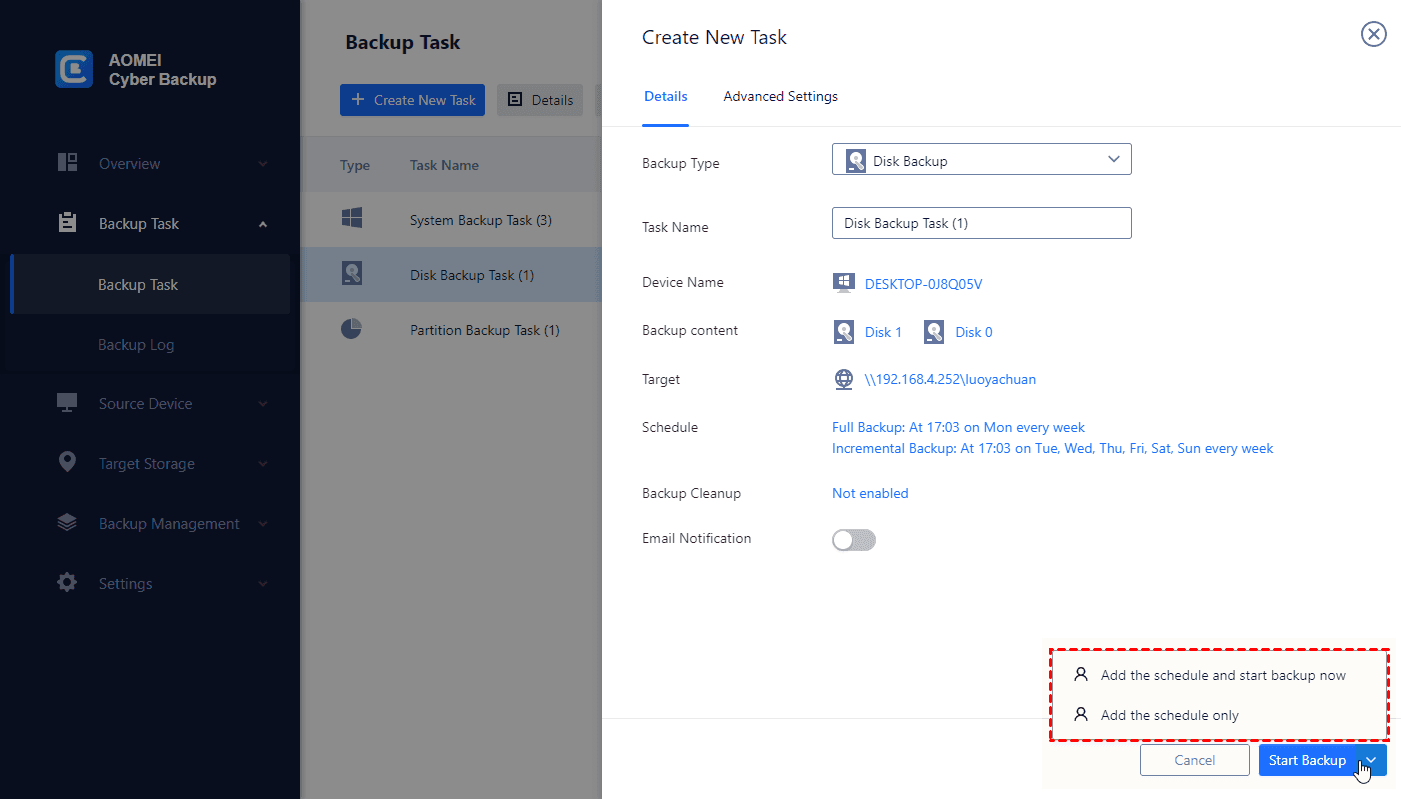 Step 3. Click the "Start Backup" button to execute. You can choose "Add the schedule and start backup now" or "Add the schedule only".