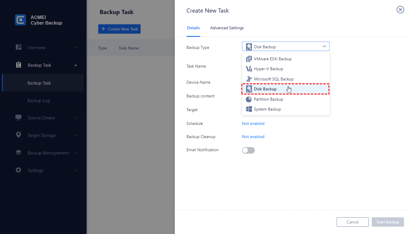 Step 2. Click "Backup Task" > "Create New Task". Choose a Backup type. Give a device name, and choose content. And set up your backup schedule.