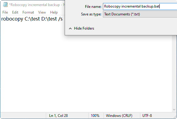 Click File > Save As. Then give it a name you like, Robocopy incremental backup, for example. Change the extension from .txt to .bat. and click Save.