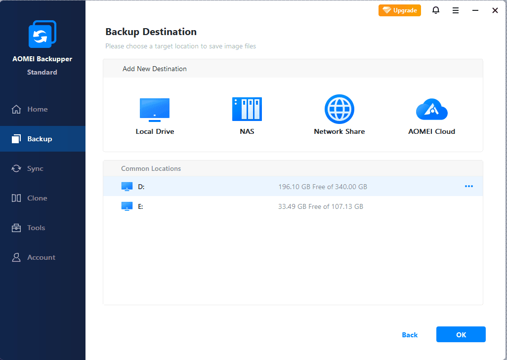Choose the backup destination. In addition to local folders or connected removable devices, you could click NAS, Network Share or AOMEI Cloud to backup to network location or cloud as you like.