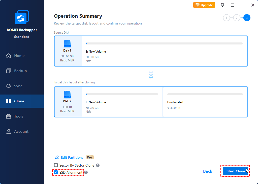 4. Check the SSD Alignment option to keep Samsung 850 at high performance. Then, click Start Clone to clone hard drive to Samsung 850 EVO SSD easily.