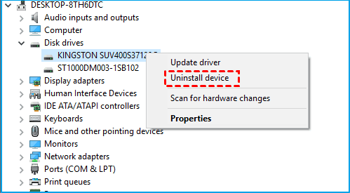 Step 2. Right-click on your problem drive and click Uninstall device. Restart your computer to reinstall this drive again.