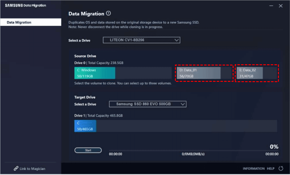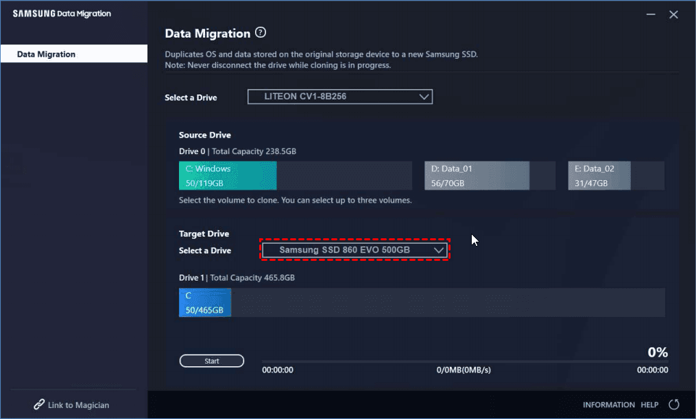 1. Connect Samsung SSD to your computer and make sure it can be recognized. Run Samsung Data Migration. It will automatically select the drive with OS installed as the Source Drive.