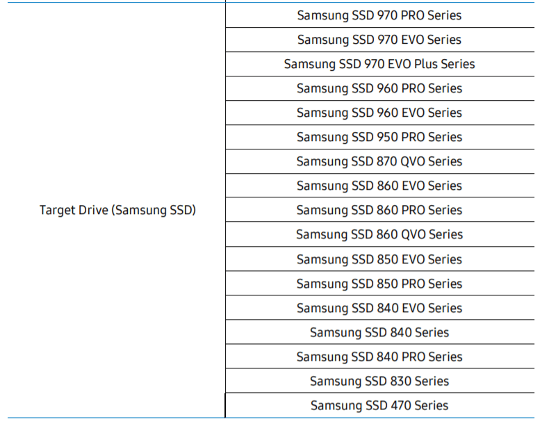 ◈ As Samsung Data Migration only supports Samsung SSDs listed in the User Manual, your target GPT SSD must be one of them.