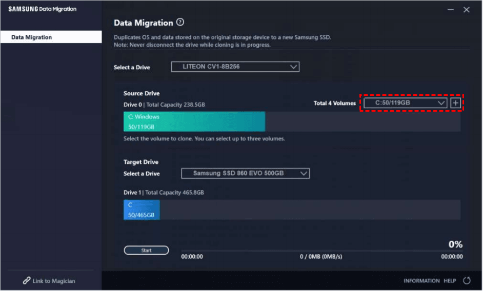 2. Run Samsung Data Migration. It will automatically detect the drive with OS installed and select it as the Source Drive.