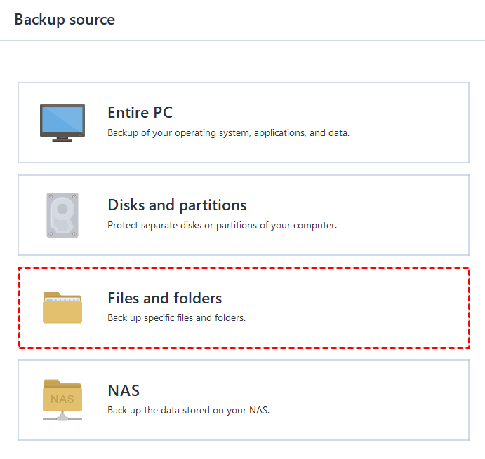 - Click Select source and then Files and Folders. Choose specific files or folders you want to backup.