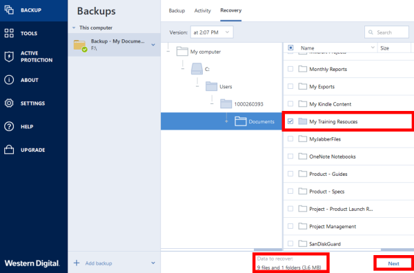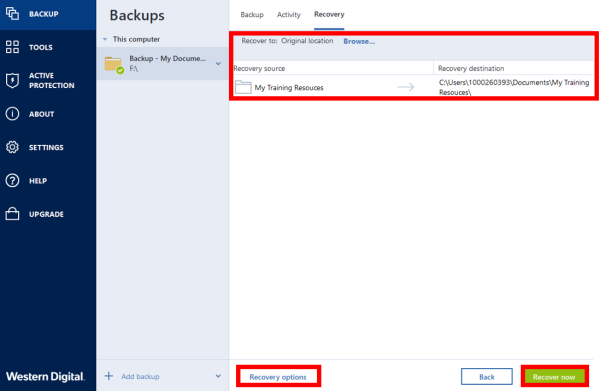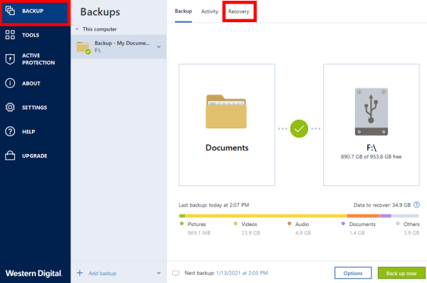 1. Start Acronis True Image for Western Digital. Click Backup > Recovery.