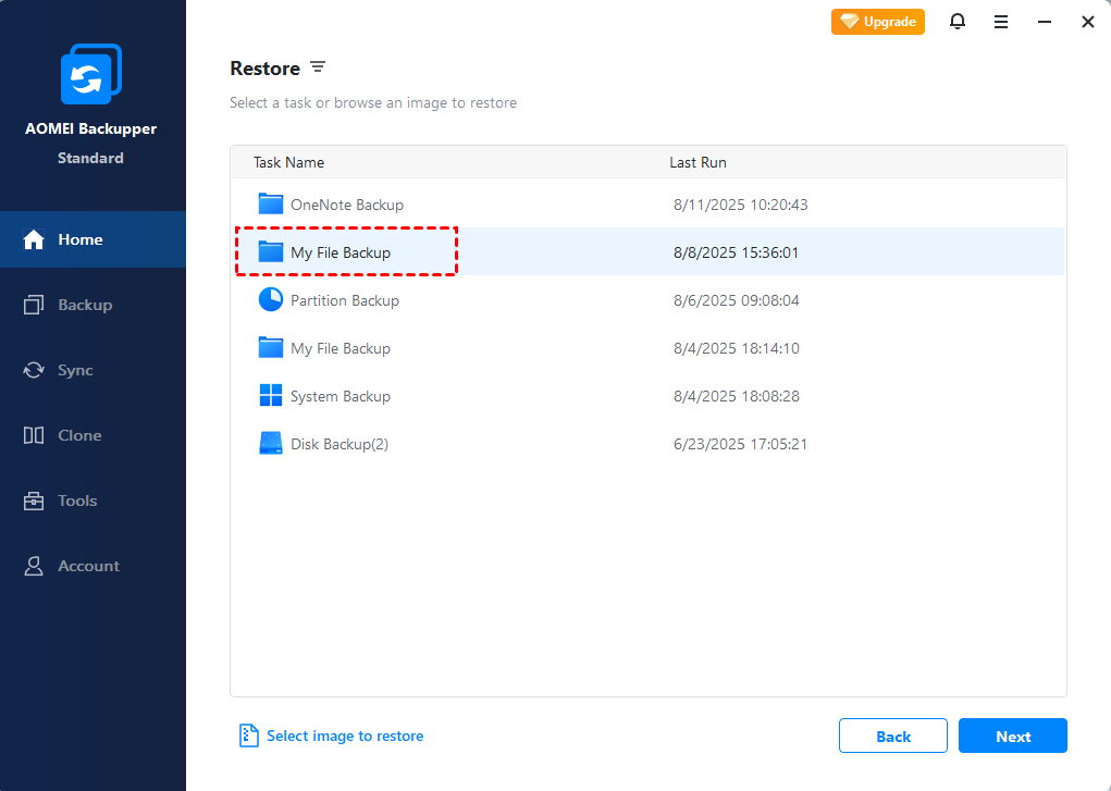 2. Select the file backup task that you want to restore from the list box, then click Next to continue.