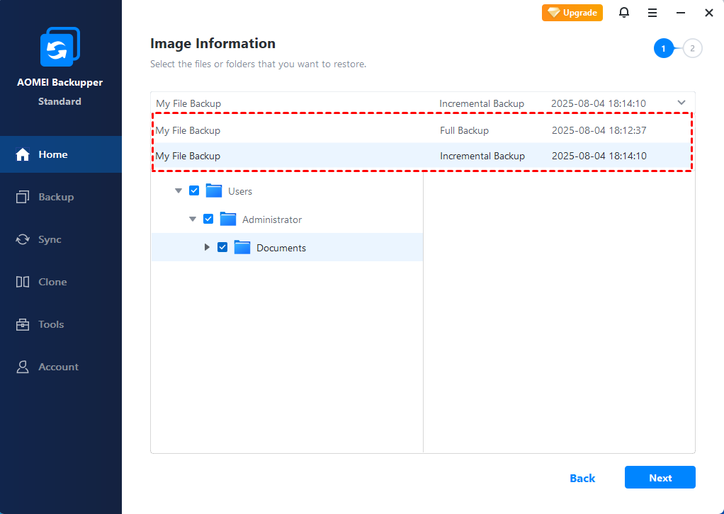 3. Choose the backup image version according to the backup time point, select files or folders you want to restore, and click Next.