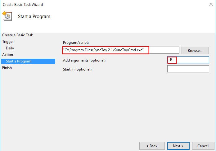 6. In the “Program/script” box, enter “C:\Program Files\SyncToy 2.1\SyncToyCmd.exe” including the quotes. You can also click on “Browse” button and locate the SyncToyCmd.exe. In the “Add arguments” box, enter –R to run all of your syncs each time.