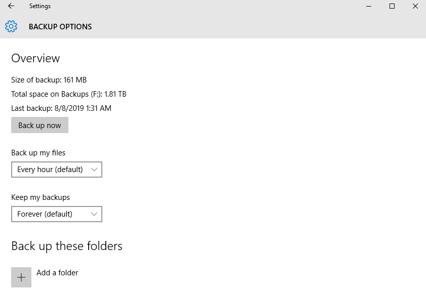3. By default, File History will auto backup your files in User folder every hour, and keep versions forever. You can adjust how often to back up, how long to keep the backups, and what other folders to back up manually.