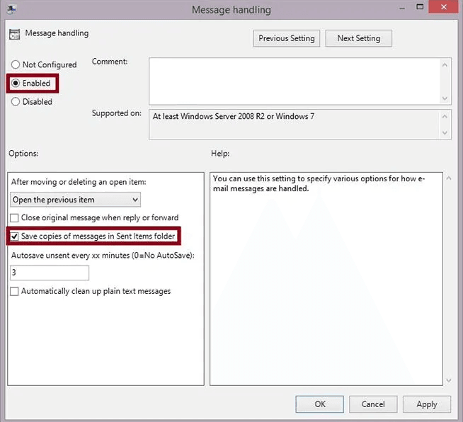 - Select Enabled on the Message handling window if that isn’t currently selected and choose the "Save copies of messages in the Save Items folder" option.