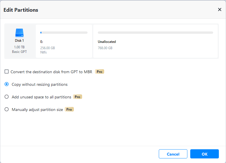 Edit Partitions: If the target disk is larger than the source disk, you can use the feature to resize your disk automatically or manually. Please upgrade to the professional version to enjoy it.