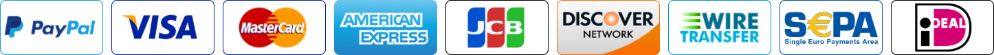 We accept PayPal, Visa, MasterCard/Euro Card, Discover, American Express, Diner's Club, JCB, and check cards or ATM cards connected with one of the major credit card companies listed above. We also accept Bank/Wire Transfer, Check/Money Order, Fax - Credit Card, Invoice.