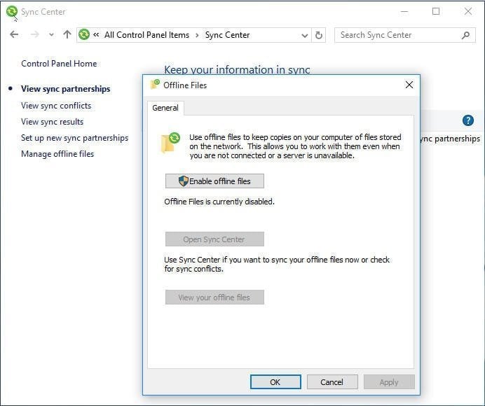 2. Click Manage offline files on the left side, then press Enable offline files, and click OK.