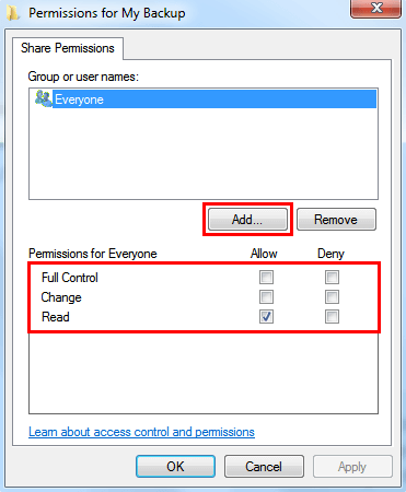 Step 4. You can click Add button to decide the user you want to share the files with by typing its name. The Read permission is checked by default, you can check other permissions as per your needs. Finally, click OK to confirm.